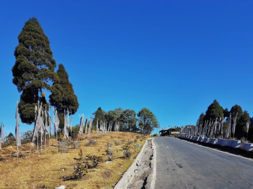 As we were starving, we would jump whenever we saw an eatery alongside the road, but our driver told us to be patient and claimed that he was taking us to some awesome place for breakfast. After crossing a lot more turns and trees, we reached a patch of road where the forest was less dense, we also spotted a few white flags hoisted on the side of the road. Going by our experience on the hills, looked like we had reached a place of significance. The car slowed down and stopped to a halt. Was it a viewpoint of breakfast time?