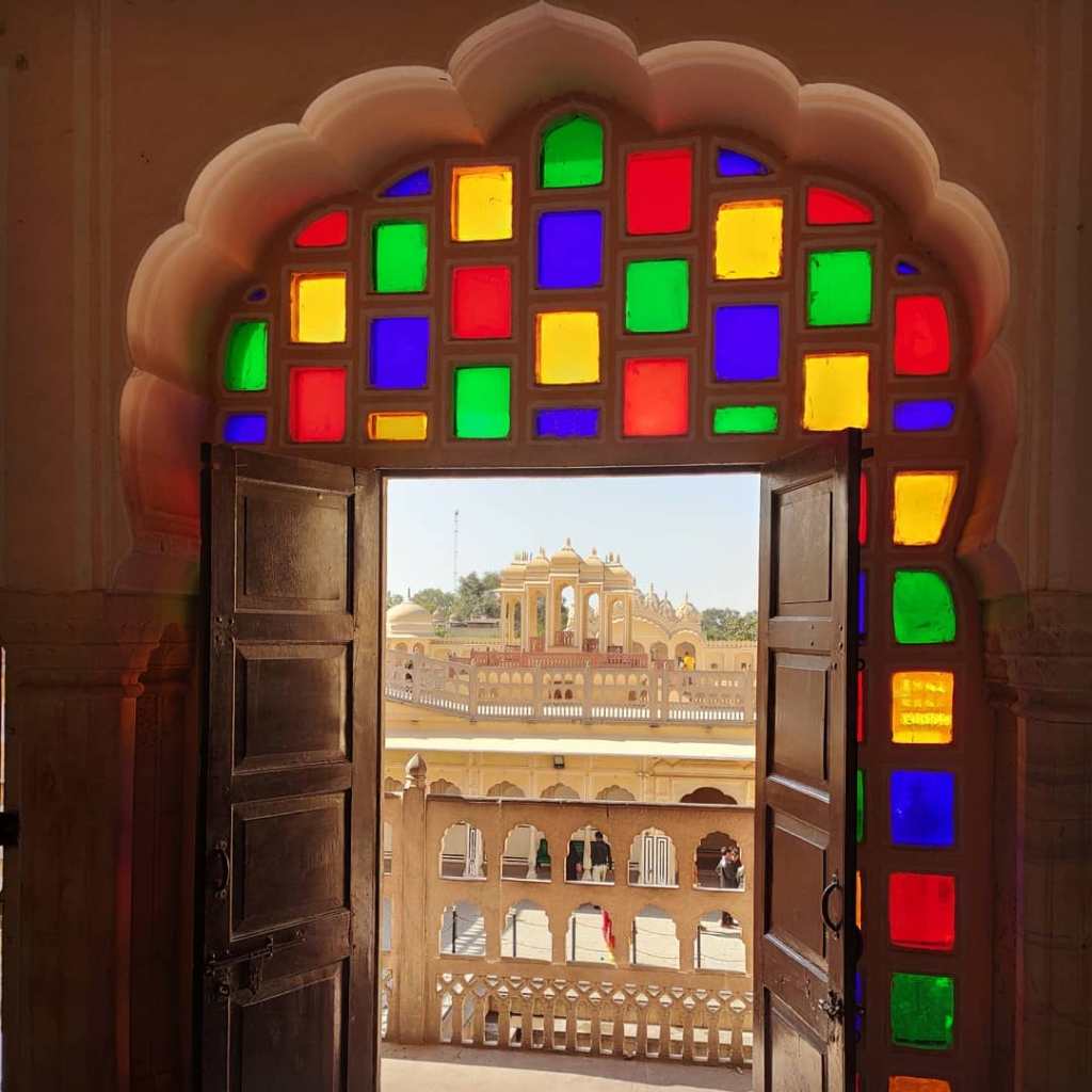 The second level is called Ratan Mandir. Ratan in hindi means gem and true to its name, it was a gem of a place. Stained glass covering door arches and widows gave an enchantingly colourful look to the otherwise plain walls. There is a balcony surrounding the entire second floor facing the inside. Basically the balcony was looking into the courtyard on the floor where the fountain sat.