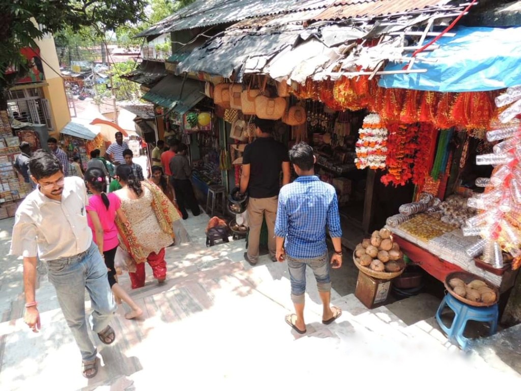 A massive gate is the first structure I saw as I reached the Kamakhya Temple complex. The red and gold colored gate had embellishments of several Hindu gods and goddesses. The center of the gate has a dome that seems like a replica of the actual temple present inside the premises. Inside the gate on one side of the road cars were parked and on the other side, rows of shops selling stuff related to puja. I dropped my shoes in one of the shoe stands and continued my walk.
