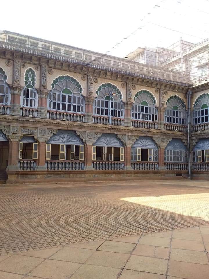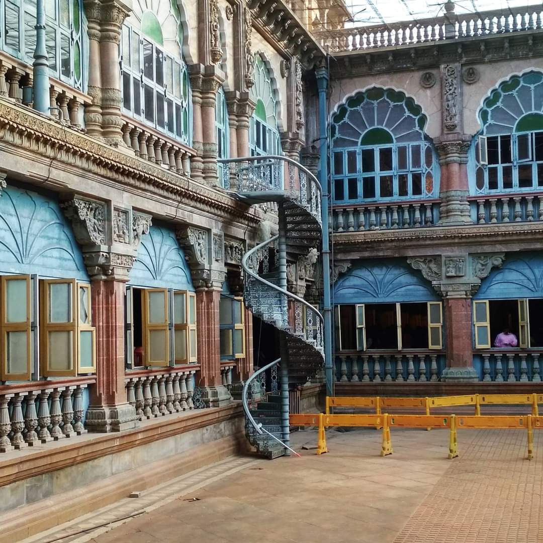 A stunning glass chandelier, imported from Czechoslovakia, hangs from the ceiling that offsets the green iron pillars. The chandelier runs on electricity, which basically ascertains the fact that the palace was one of the first buildings to be lit with electricity in the early 1900s.