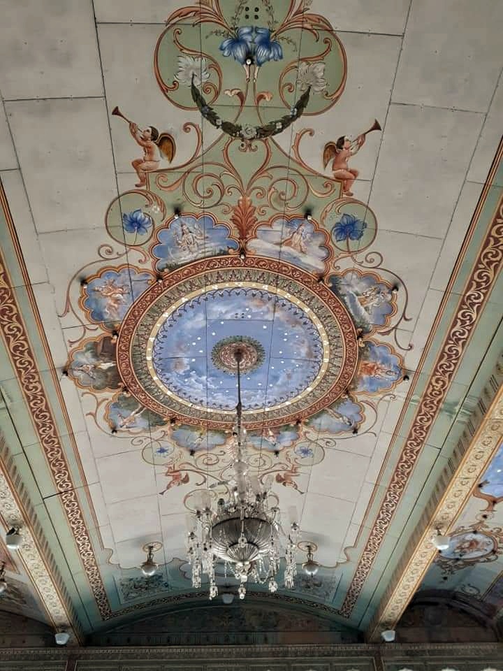We were not prepared for what awaited us next in this grand palace. A huge hall fully decorated in pink, yellow and turquoise with intricately painted columns all symmetrically spaced across the hall. There are well-spaced symmetrical arches with their golden floral filigree and an ornate stucco art ceiling enclosed within.
