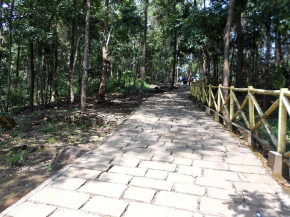 Inside the gate a cobbled path welcomed us into the lap of nature. Trees all around, some had small flowers, while others were loaded with leaves of various shades of green. The path is made of stone, with concrete railings on one side, and uphill climb on the other. The path goes up and then down like a wave in the ocean, and to be honest its quite a trek.