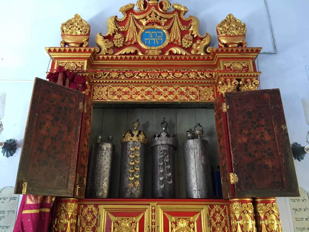 A pulpit with brass rails is built in the centre of the room. An exclusive gallery for women with gilt columns, a carved teak ark etc can be seen in the synagogue. The teak Ark houses four scrolls of Torah (the first five books of Old Testament) and they are encased in silver and gold. Two gold crowns presented to the Jewish Community by the Kings of Kochi and Travancore are also kept here. Sadly it was covered when I went there, so I googled and found this image.