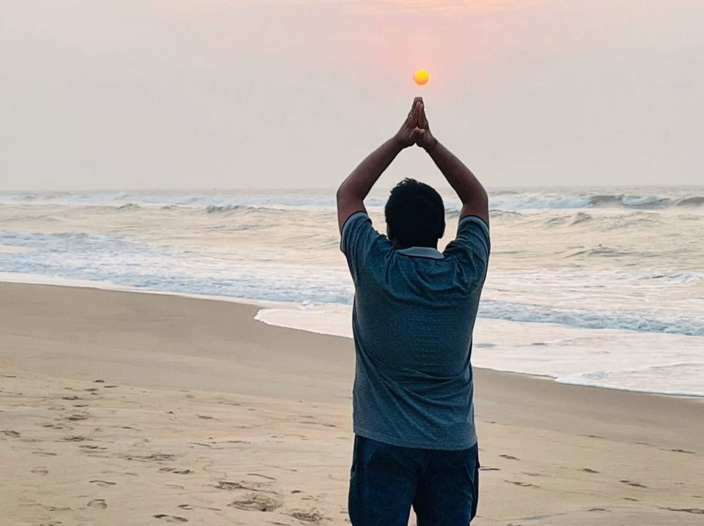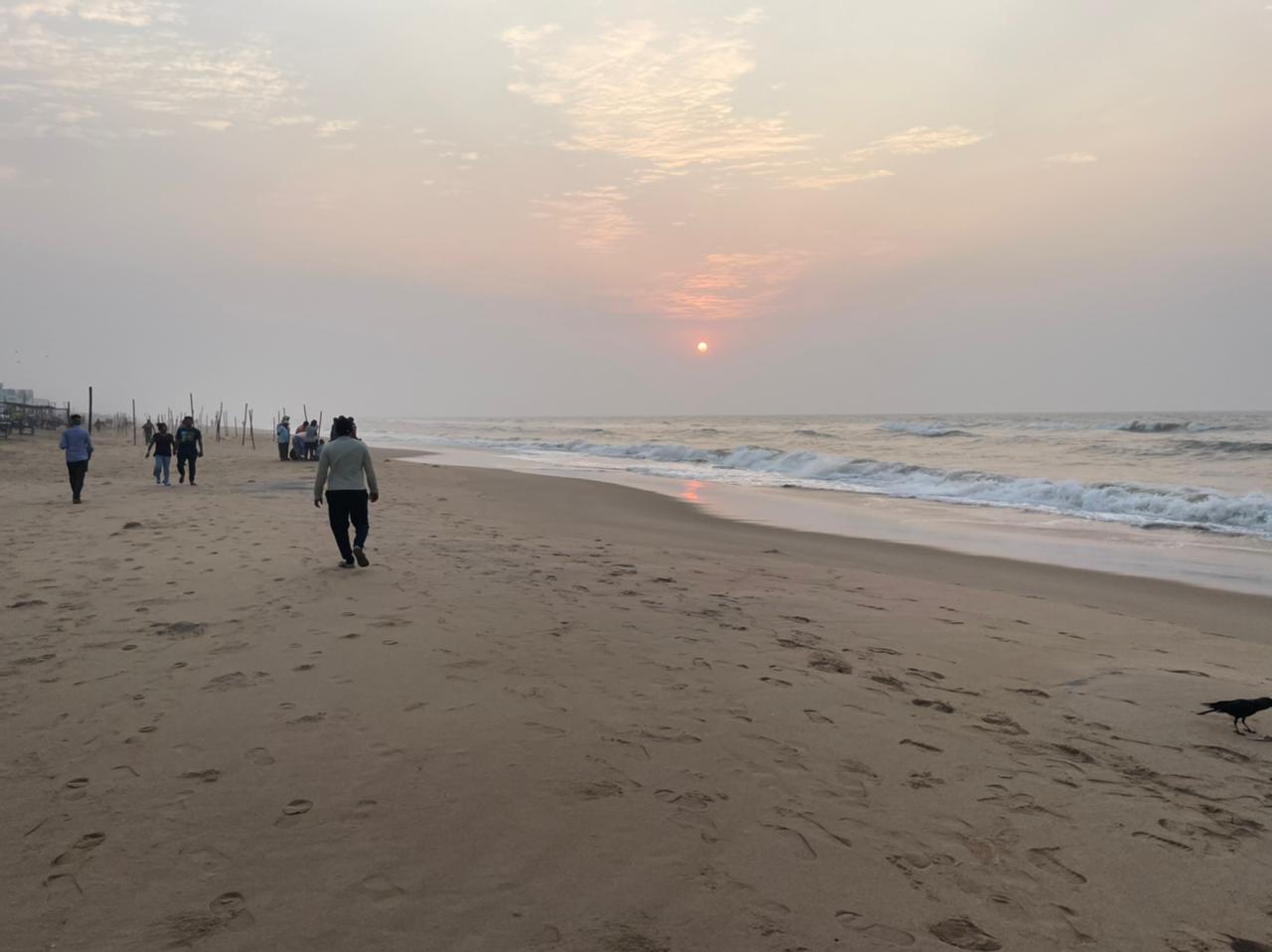 It was not dark outside, but not fully lit either. I could sense the sun on the horizon but it was still under the cloak of the sea. The blue sky was hinting a bright tinge of orange glow in the eastern side, indicating the imminent arrival of the sun. The sound of the ocean, unadulterated by hawkers and chirping tourists, was pure bliss. And just like that the sun came up, and suddenly the soft light of the dawn was replaced by the bright hue of the sun.