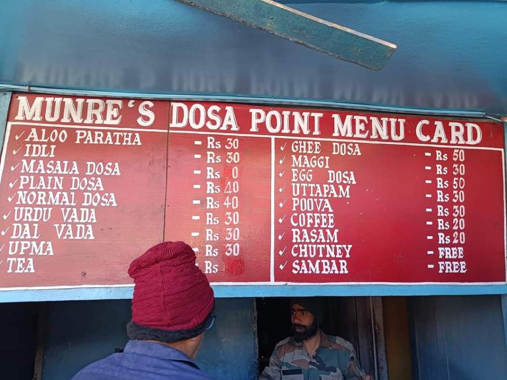 A short flight of steps lead to this humble shack, built of prefab walls and roof. It had a small window in the entry, which had two army men, taking down orders and payment of the food. On the side, it had small seating area having a few tables and chairs, which were all full. The menu was painted on the wall and the prices were one of the lowest we found across Sikkim, with a Dosa costing Rs. 50 and tea Rs. 10.