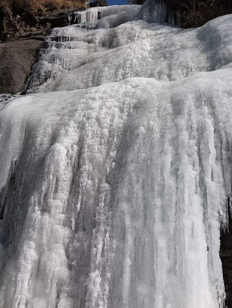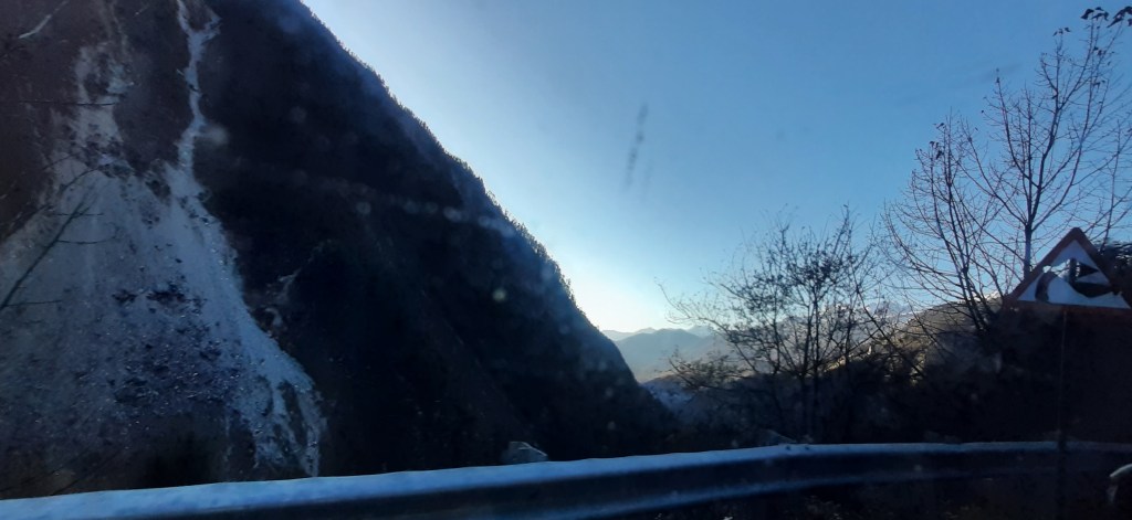 The temperature in the night had dipped to below 0, and hence all small streams of water that usually drizzled down the hills, were frozen solid. Black ice had formed on the road at places, which had to be navigated carefully, so as to not skid, go off the road and down the hills. The only semblance of any liquid water was a heavy gusty stream flowing down in the valley. This stream will later in its course become Teesta river.