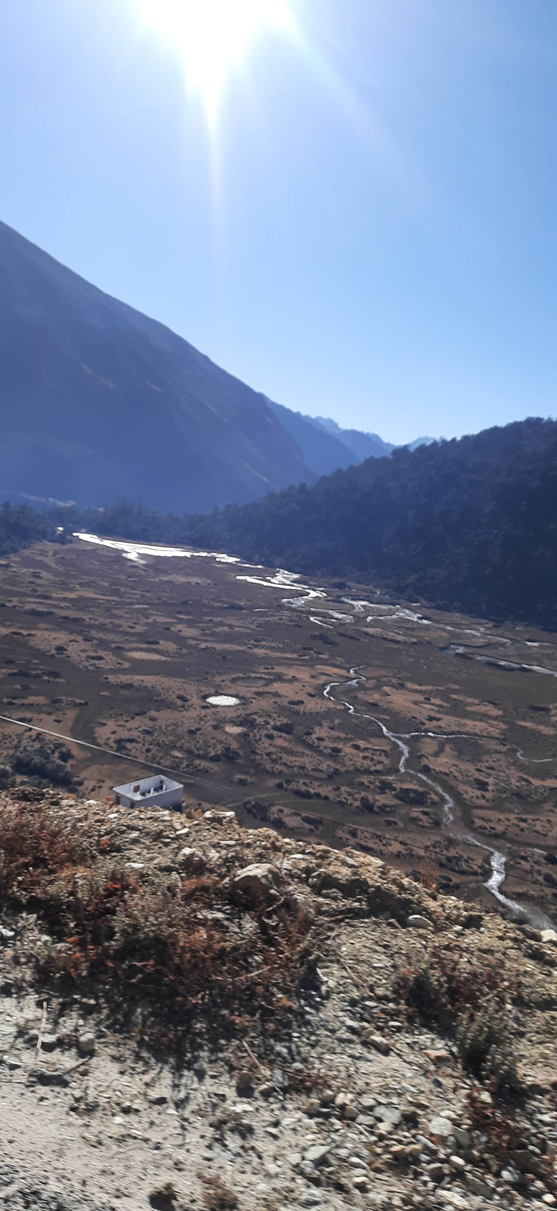 As I bid adieu to the snow, our cab started hurtling down towards Thangu, and then at some point started to ascend again towards Gurudongmar. While moving from one hill to another, we saw a flat valley below. Its the Chopta valley which offers a sight to behold during spring, when the whole place is covered in greenery. Just imagine a green valley with a meandering white water river flowing idly through it. In November however it is not so much of view, as most of the vegetation dies off due to the chilly weather.