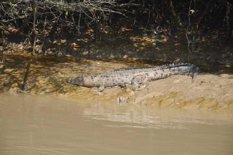 Just as we were loosing patience our guide pointed out towards the northern bank and shouted “kumbhira!”, meaning crocodile in Odia. As we turned our gaze in that direction we caught our first glimpse of a giant salt water Crocodile idling on the bank of the water body. I had seen crocs earlier in Zoos, but seeing one in the wild, is a surreal feeling that can’t be described in words.