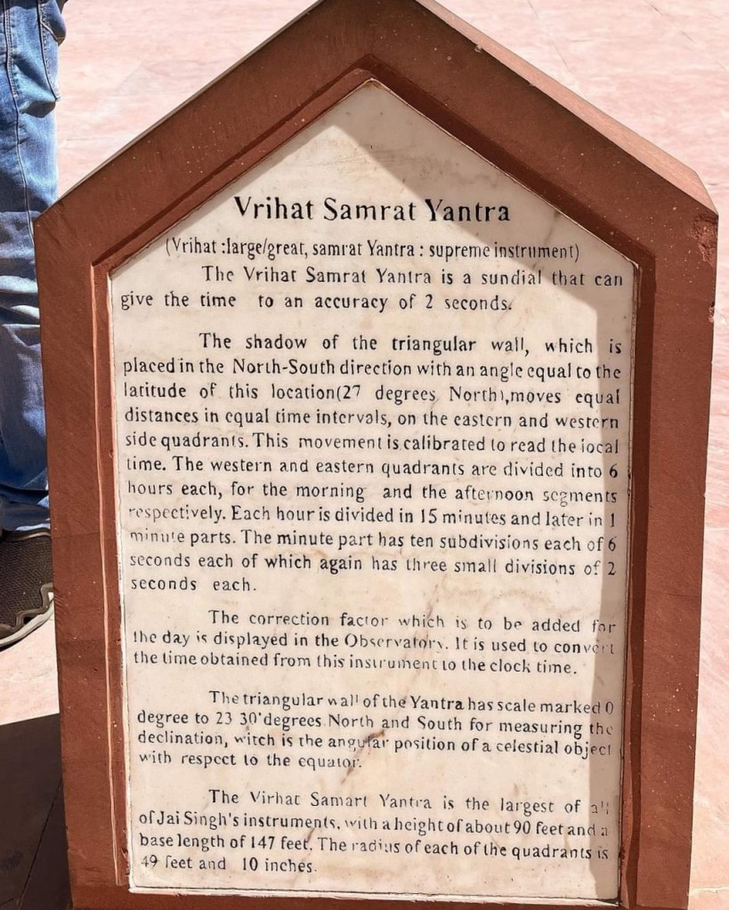 10 times bigger than the Laghu Samrat Yantra, the Vrihat Samrat Yantra is the largest sun dial in the world. The time displayed, is always within 2 seconds of modern clocks, the principle is same, it’s the accuracy and the size that makes it an improvement over the Laghu Samrat Yantra.