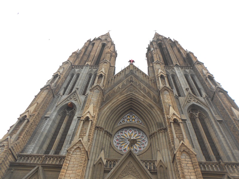Our decision proved to be correct, as the church, a Neo-Gothic marvel, is a massive structure. It is said that the architecture is inspired by the Cologne Cathedral in Germany. The height of the two towers (church’s spire) is 175 feet, which gives a majestic contribution to the city’s skyline. The 12 feet high crosses on the spires make this church one of the tallest in Asia. There are 3 ornamental doors at the front and several doors on the sides that lead to the prayer hall.