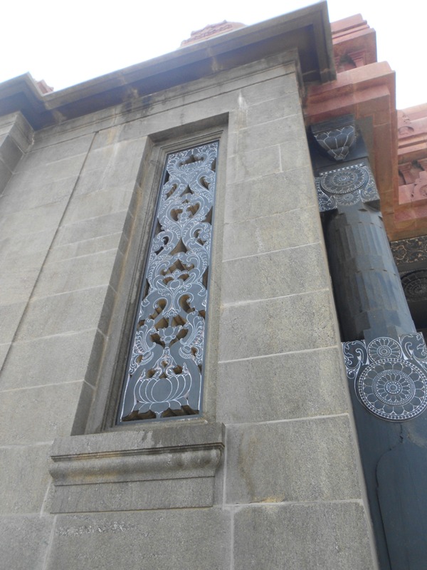 Mukha Mandapam is technically the porch of the memorial, with artistic carvings on the ceiling, beams and columns. Various sections of this structure are inspired by multiple temple building styles. For example, the Pallava style corner foliage, Ajanta style pillars and ceiling motifs. The walls, pillars and ceilings are all built using different colored granite.The flooring of the Mukha Mandapam is done in polished red and blue granite.