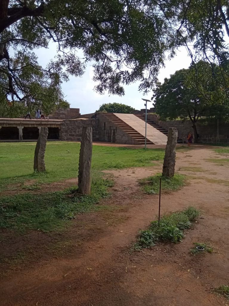 Long corridors flank all the sides of the fort, which didn’t have any doors or windows, just a series of stone pillars supporting the ceiling. The pillars were plain without any engravings. At one end of one such corridor a series of steps with a huge ramp in the middle lead to the top section of the fort. This top section, was just the boundary wall of the fort, from where in the old days cannons used to be stationed.